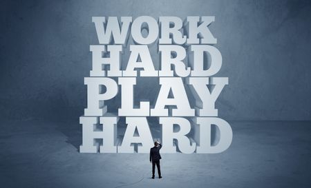 A confident salesman in suit standing in front of illustrated block letters saying work hard play hard concept