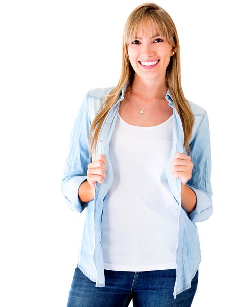 Confident woman smiling - isolated over a white background