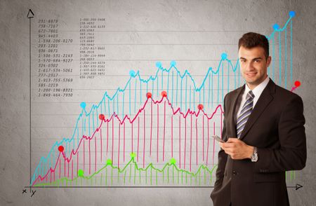 A confident young businessman standing in front of a a chart with graphs and numberswhile talking on the phone concept
