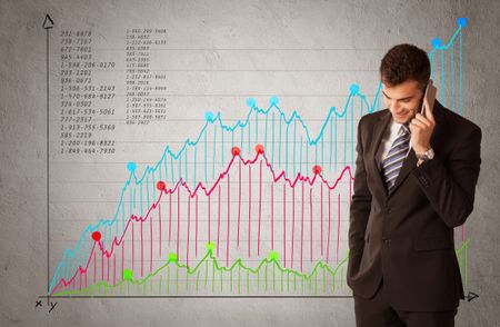 A confident young businessman standing in front of a a chart with graphs and numberswhile talking on the phone concept