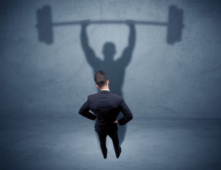 A confident young elegant salesman with briefcase facing a wall, looking at his strong, weight lifting shadow concept