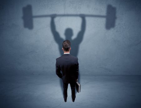 A confident young elegant salesman with briefcase facing a wall, looking at his strong, weight lifting shadow concept