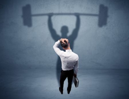 A confident young elegant salesman with briefcase facing a wall, looking at his strong, weight lifting shadow concept
