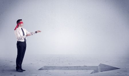 A confused blind salesman standing in front of a drawn arrow on the floor pointing in the right direction concept.