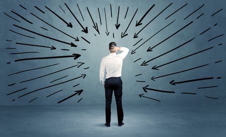 A confused businessman under pressur after making a bad decision illustrated with drawn arrows pointing at him in clear blue urban space concept