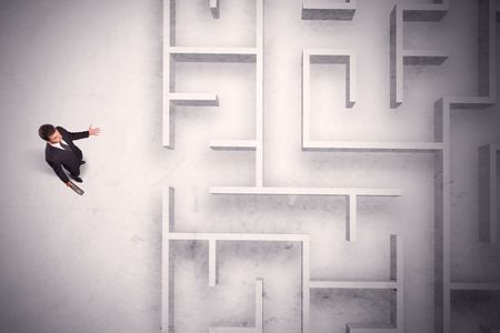 Confused businessman standing at a maze wall with grungy background