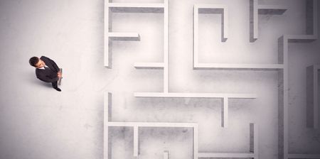 Confused businessman standing at a maze wall with grungy background