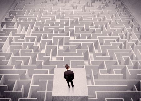 A confused businessman thinking while standing on a square platform above a detailed maze