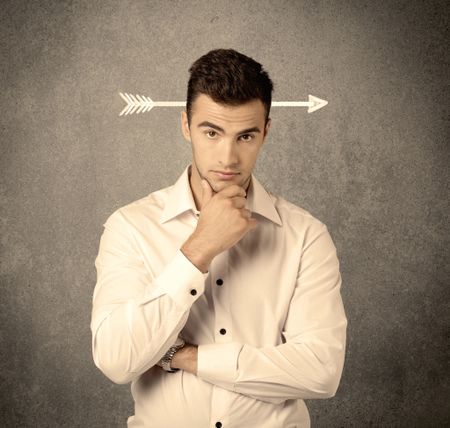 A confused young business guy giving thumbs up with a drawn arrow going through his head concept
