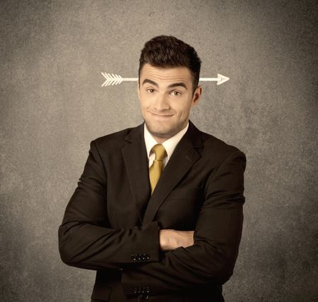 A confused young business guy giving thumbs up with a drawn arrow going through his head concept