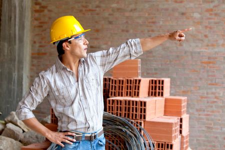 Construction worker at a building site pointing at something