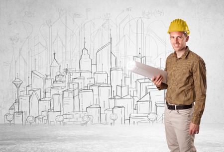 Construction worker with cityscape background drawing