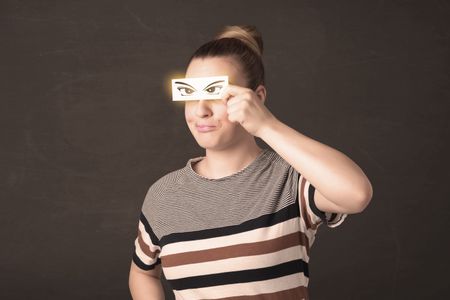 Cool youngster looking with a paper hand drawn eyes concept