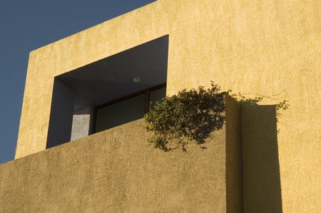 Corner of stucco house, earth tones, with creeper, private porch, after sunrise -- view from street below