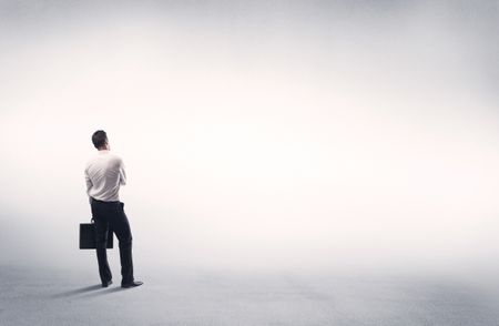 Corporate business male in modern suit standing in big blank empty grey space concept