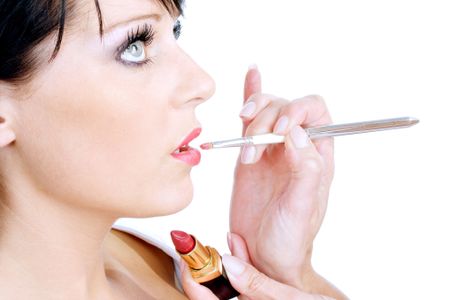 Cosmetics being applied to female model on white background