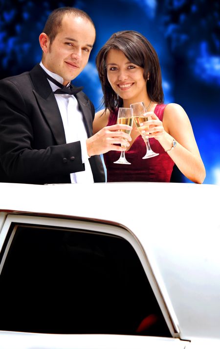 couple coming out from a limousine heading to a party with champagne glasses