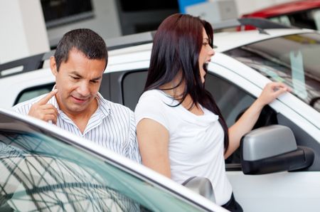 Couple at the dealer looking for a new car