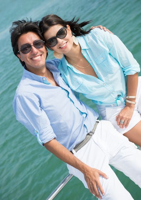 Couple enjoying the summer in a boat looking very happy