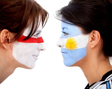 Couple of football fans with their faces painted isolated over white - Argentina versus England
