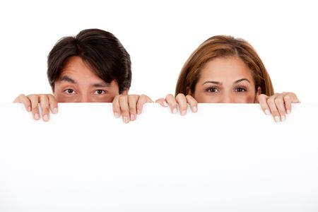Couple holding a banner and hiding half their face - isolated