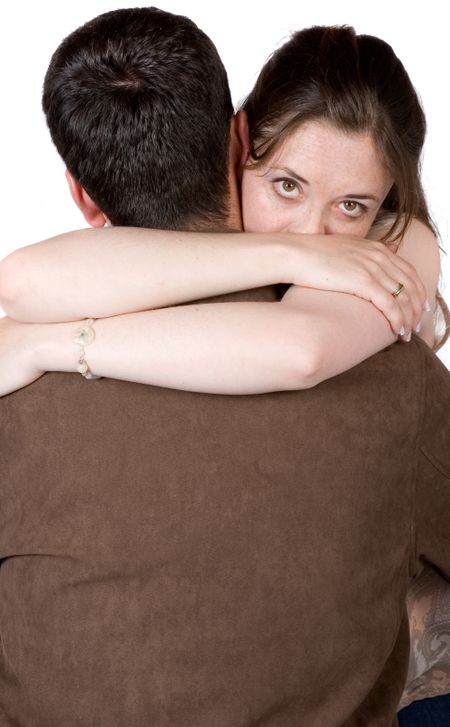 couple hugging - woman is looking intensely at the camera over his shoulder - white background