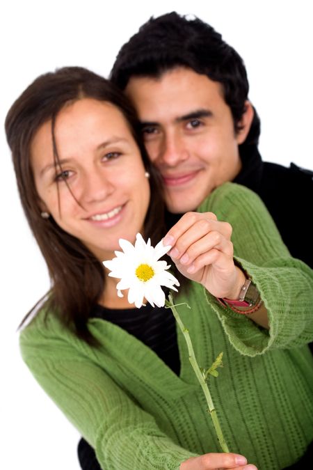 couple in love with a daisy flower - isolated over a white background with the focus on the flower