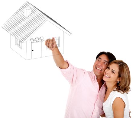 Couple pointing a house drawing - isolated over a white background