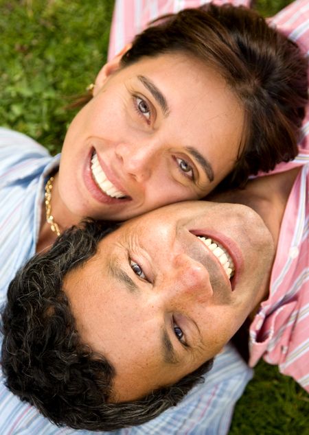 couple portrait on the floor outdoors where both are smiling and looking happy