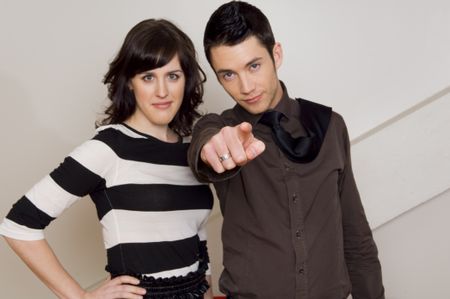 Couple serious about pointing at camera.