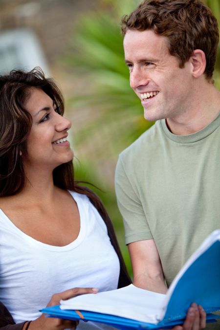Couple of students with notebooks outdoors and smiling