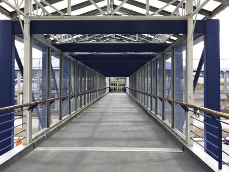 Covered bridge, with glass sides and ceiling, for pedestrians to walk safely over urban thoroughfare