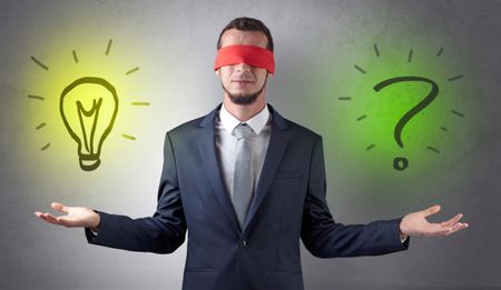 Covered eye businessman with bulb and question sign symbols around