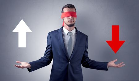 Covered eye businessman choosing between two directions