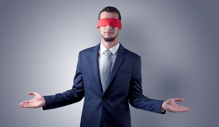Covered eye, indecisive businessman standing blind in front of a wall