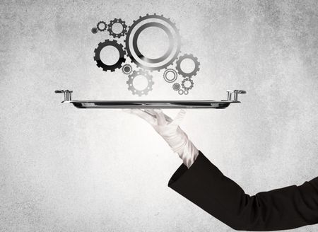 Crank wheel machine working concept with racks served on silver plate by hand in white glove and industrial grey wall pattern background.