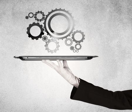 Crank wheel machine working concept with racks served on silver plate by hand in white glove and industrial grey wall pattern background.