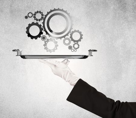 Crank wheel machine working concept with racks served on silver plate by hand in white glove and industrial grey wall pattern background.