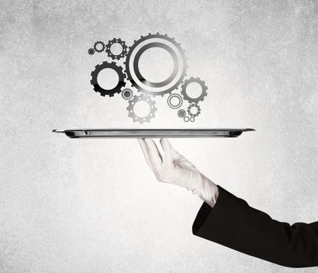 Crank wheel machine working concept with racks served on silver plate by hand in white glove and industrial grey wall pattern background.