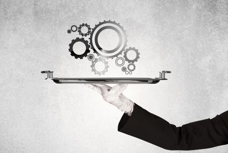 Crank wheel machine working concept with racks served on silver plate by hand in white glove and industrial grey wall pattern background.