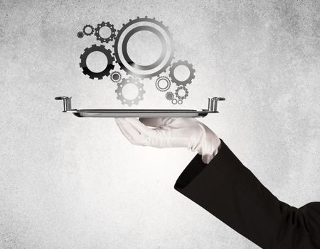 Crank wheel machine working concept with racks served on silver plate by hand in white glove and industrial grey wall pattern background.