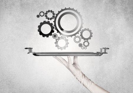 Crank wheel machine working concept with racks served on silver plate by hand in white glove and industrial grey wall pattern background.