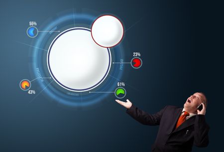 crazy businessman in suit holding a phone and presenting abstract modern pie chart with copy space