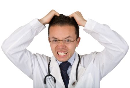crazy male doctor over a white background