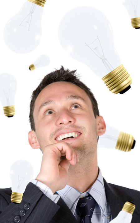 creative business man smiling with lots of ideas on his head - over a white background