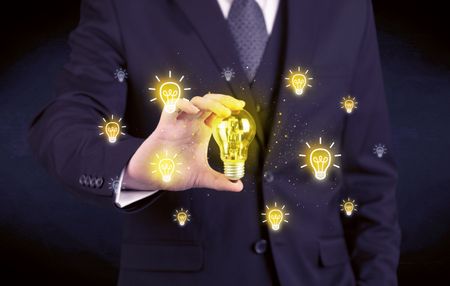 A creative businessman has a bright idea concept with office worker holding light bulb in foreground.