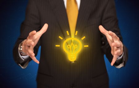 A creative businessman has a great bright idea illustrated by holding a drawn light bulb in the hand concept