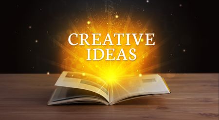 CREATIVE IDEAS inscription coming out from an open book, educational concept