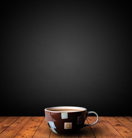 Cup of drink on wooden table with dark background