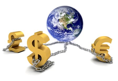 Currency symbols carrying the world with a chain isolated on white